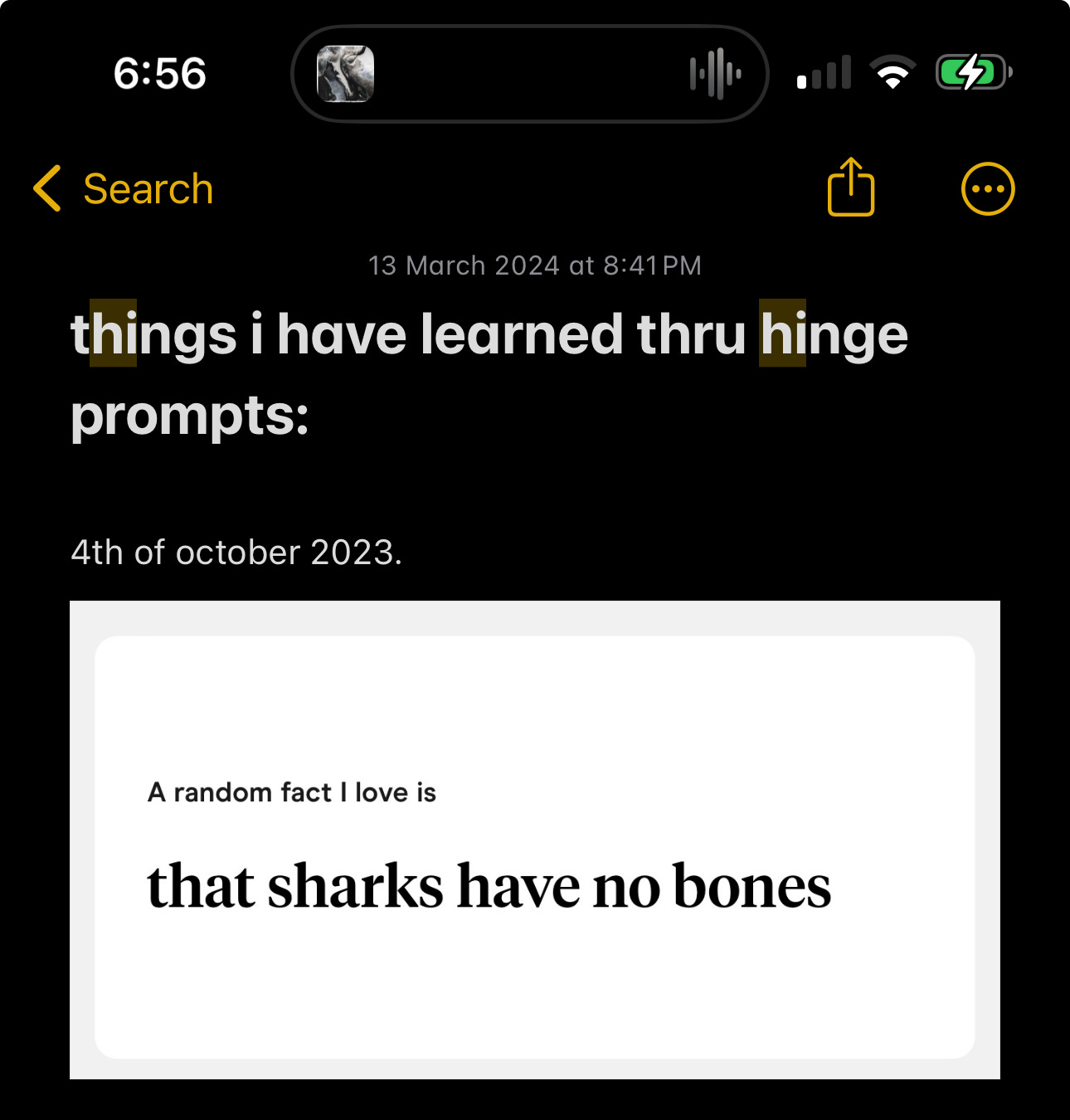 so here’s everything i’ve learned through hinge prompts! screenshotted from the notes app itself!