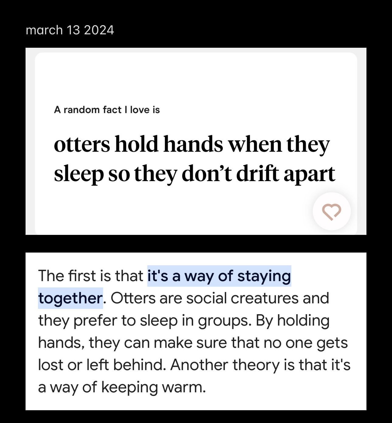 but i’m a dreamer! an idealist! a person with majority air signs so of course i spend most of my time stuck in the clouds. i can’t go back on hinge because i can’t pretend that i’m ready to date anyone and im tired of being sent memes that are like: send this to your lesbian besties whose friendships consist of failed talking stages! can i just clear the record and say thats like … 30% of my friendships. if that. maybe 35%…